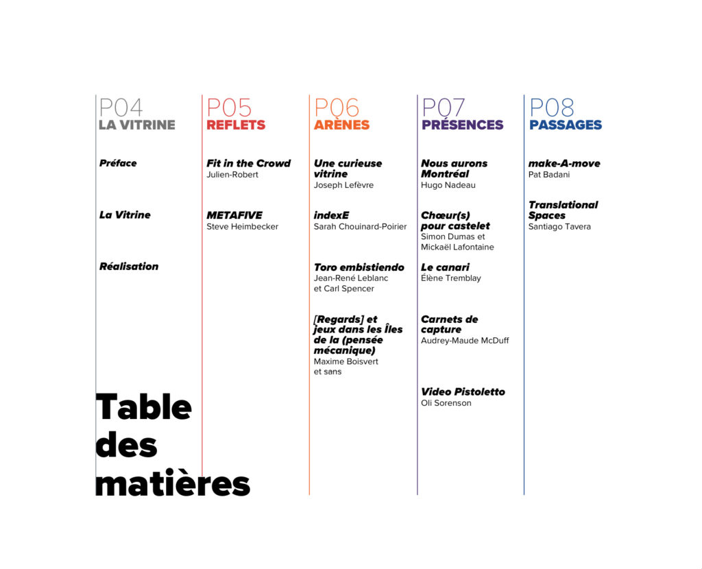 Ce livre enrichi, réalisé par la designer Isabelle Gagné, documente avec des textes, photos et vidéos les œuvres des 13 artistes et duos canadiens : Hugo Nadeau, Audrey-Maude McDuff, Pat Badani, Steve Heimbecker, Oli Sorenson, Joseph Lefèvre, Santiago Tavera, Maxime Boisvert et sans, Julien-Robert, Élène Tremblay, Jean-René Leblanc et Carl Spencer, Sarah Chouinard-Poirier, Simon Dumas et Mickaël Lafontaine.