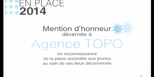 L’Agence TOPO a reçu le 12 juin dernier du Forum jeunesse de l’île de Montréal une  « Mention d’honneur en reconnaissance de la place accordée aux jeunes au sein de ses lieux décisionnels ». La cérémonie de remise de prix avait lieu à l’hôtel de ville de Montréal pour le cocktail de La relève en Lire la suite »