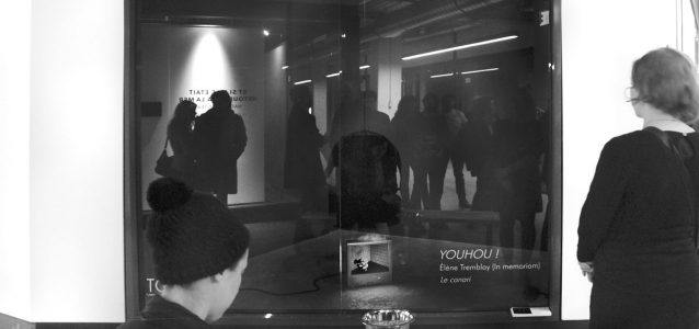 Paule Mackrous Projeté dans la vitrine, un taureau au fond d’un enclos nous regarde droit dans les yeux. Trois cercles au sol présentent des « traces » de bottes de cowboy entourées d’un lasso, invitant le spectateur à y poser les pieds. Lorsqu’on s’installe sur le premier, le taureau s’avance un peu; sur le deuxième, il s’approche Read more »