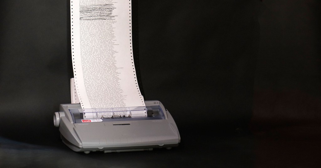 Alors que la dactylo s’active pour former un texte hybride, un écran qui jouxte la dactylo affiche des corrections effectuées par les artistes pour rendre cohérent le poème générè par l’algorithme. Une visualisation de ce processus devenu mécanisé génère des patterns, pendant qu’un logiciel récite les poèmes. La machine produit, corrige, imprime et diffuse ad infinitum des éléments de notre mémoire collective; elle complète elle-même la boucle de production, laissant l’étrange sensation qu’elle est autosuffisante. Assimilant les actions humaines, elle forme une performance dans laquelle se déploie une esthétique singulière, propre à son langage automatisé.
